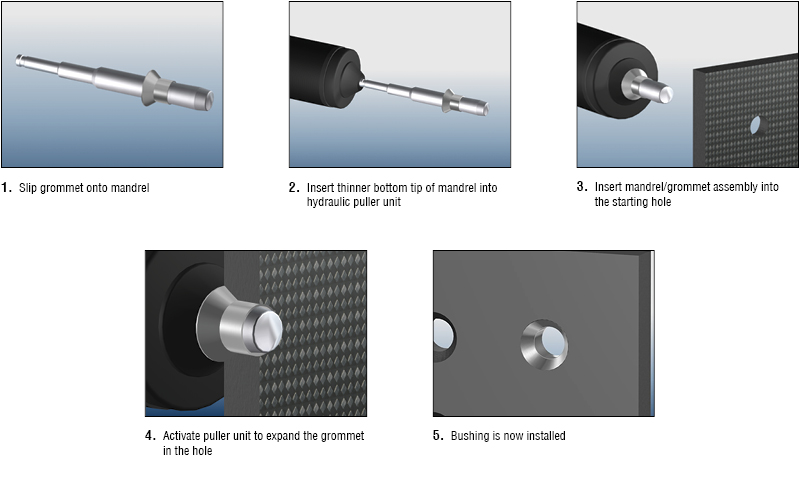 The amount of radial expansion of the grommet in the hole is carefully tailored to ensure adequate grommet retention and at the same time prevent localized damage to the composite. The GromEx system is easier to install, more reliable, and has improved performance over adhesive bonded or swaged grommets.